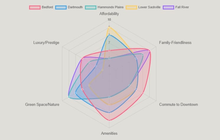 This chart can help you see at a glance how different suburbs might align with your priorities. For example, if affordability is paramount, Lower Sackville scores highly, whereas if family-friendliness and green space are top concerns, Bedford, Hammonds Plains, and Fall River show strong appeal.